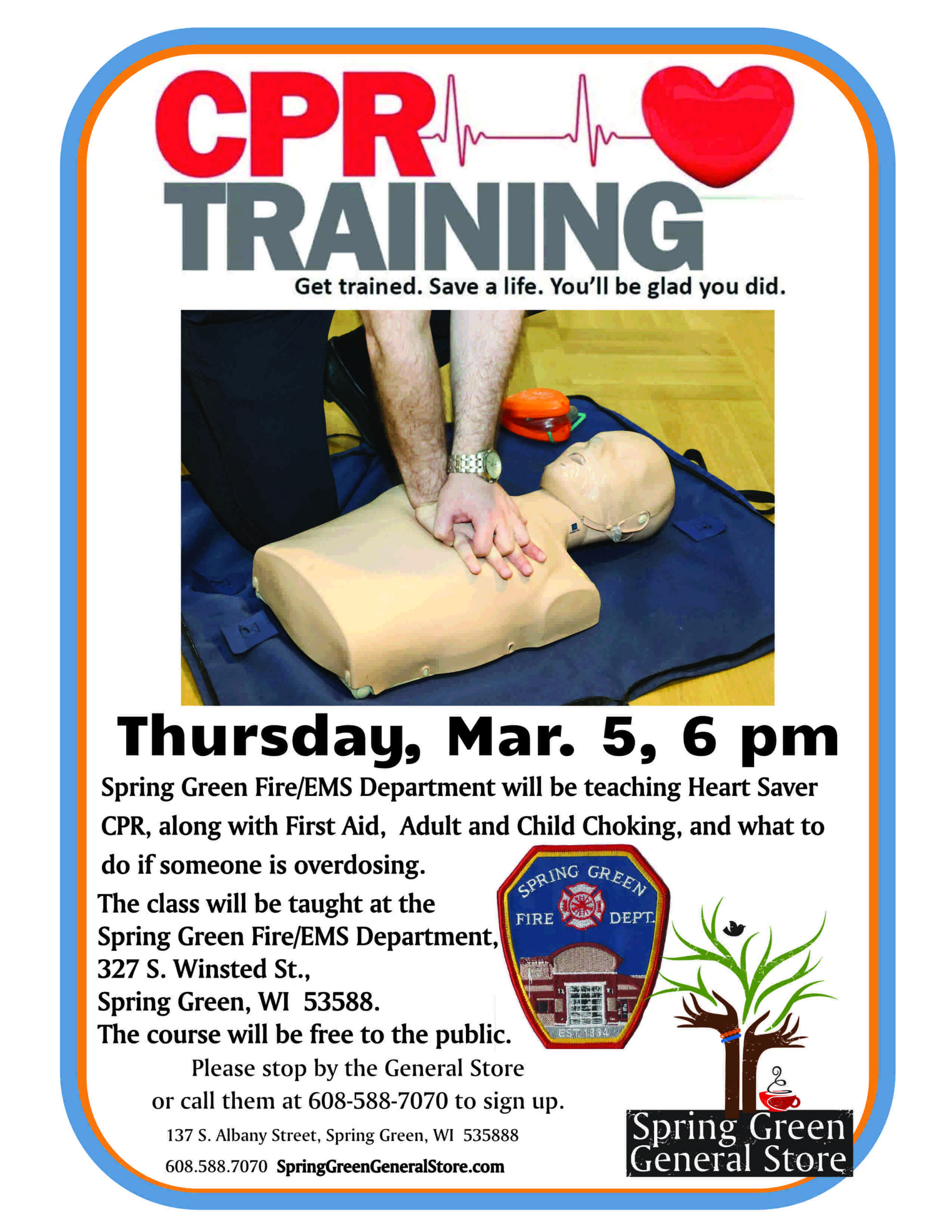 Spring Green Fire Department 327 S. Winsted Street, Spring Green, W, United StatesSpring Green Fire/EMS Department will be teaching Heart Saver CPR, along with First Aid, Adult and Child Choking, and what to do if someone is overdosing. The class will be taught at the Spring Green Fire/EMS Department, 327 S. Winsted St., Spring Green, WI 53588. The course will be free to the public but please […]